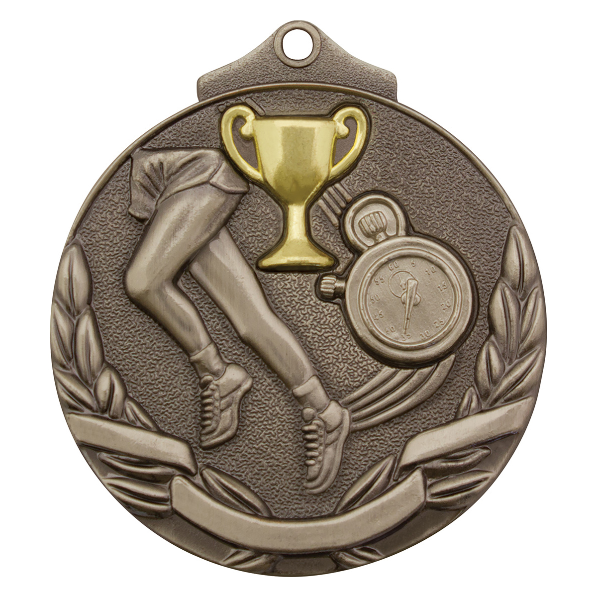Classic antique medal featuring distinctive two-toned design. Medal a fantastic option for track and running events with a winners cup inspired design.