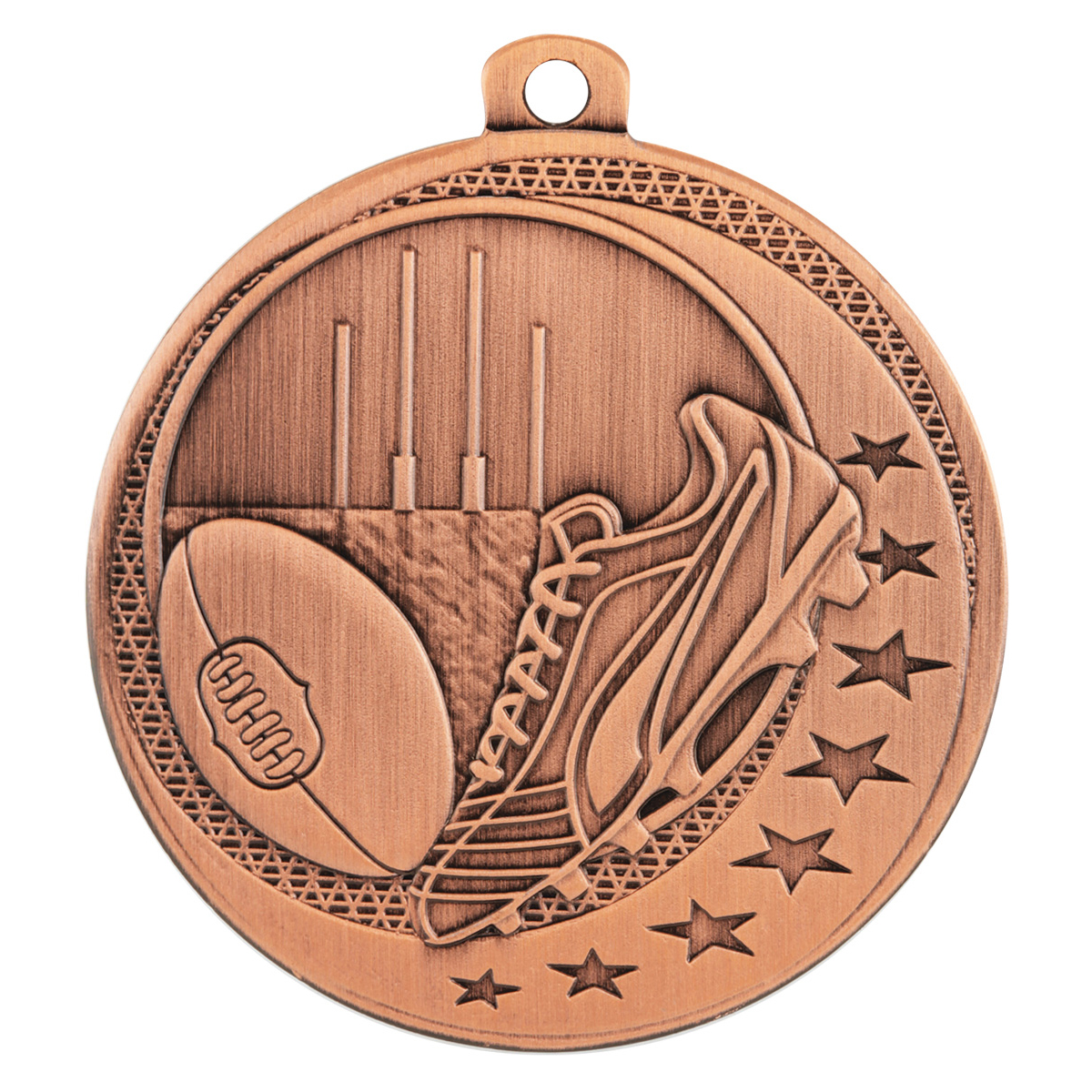 Wayfare medals offer an affordable range of stylish star-inspired medals for different sports & activities. Aussie Rules medal features footy boot, ball and goal posts.