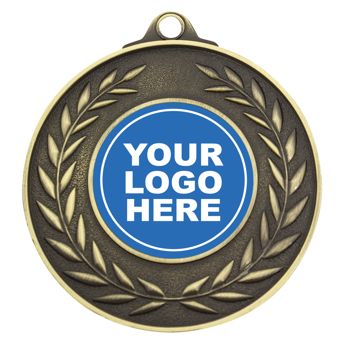 Classic Wreath design medal in antique gold. A commemorative wreath allows space for a 25mm insert.