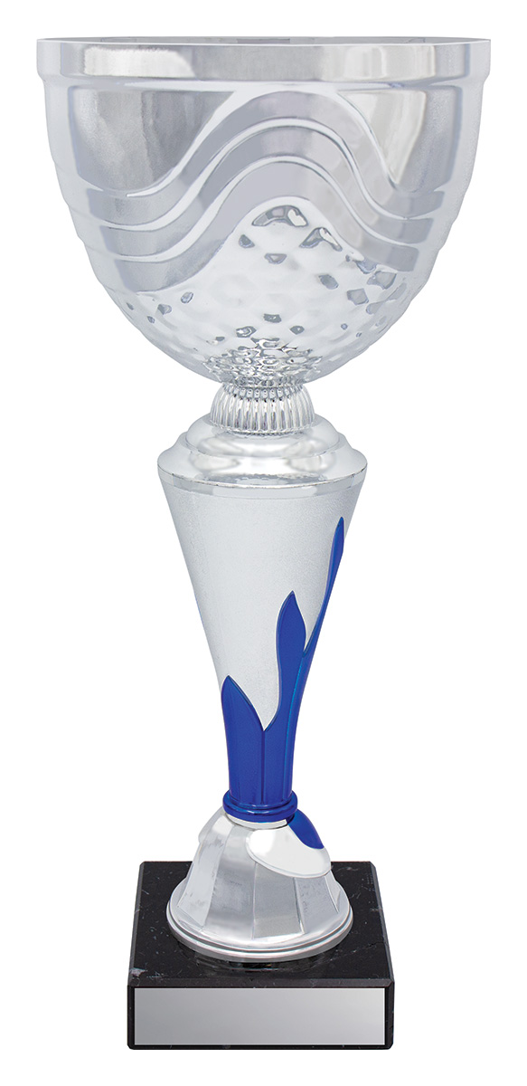 Exciting blue & silver cup trophies, the Flame metal cup offers options over number of sizes with a brilliant design for your event. Metal bowl, plastic stem and marble base.