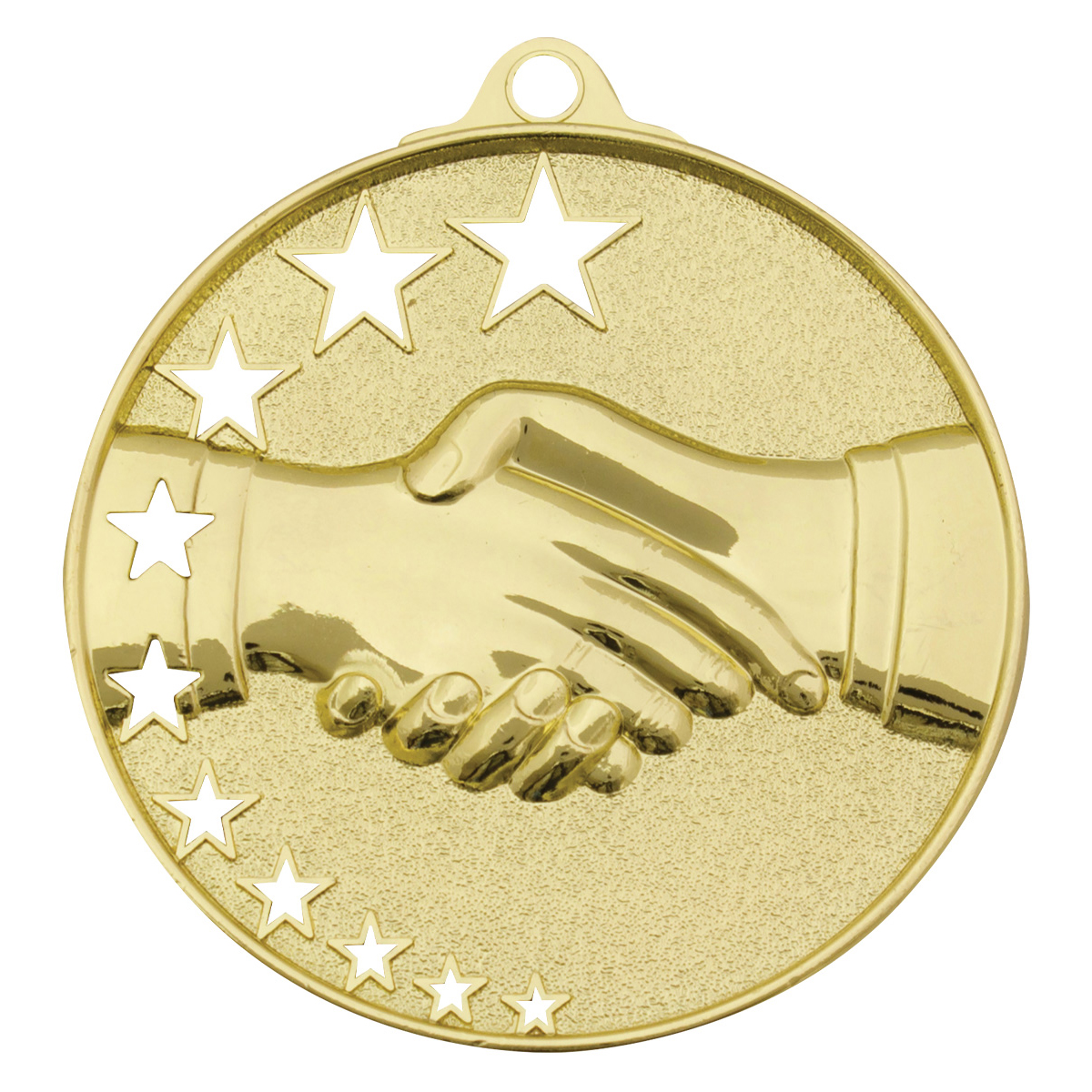 Effective medal to acknowledge an achievement for your event. Handshake medal part of the popular star series with medals for all types of sports and activities. This medal is available in gold only.