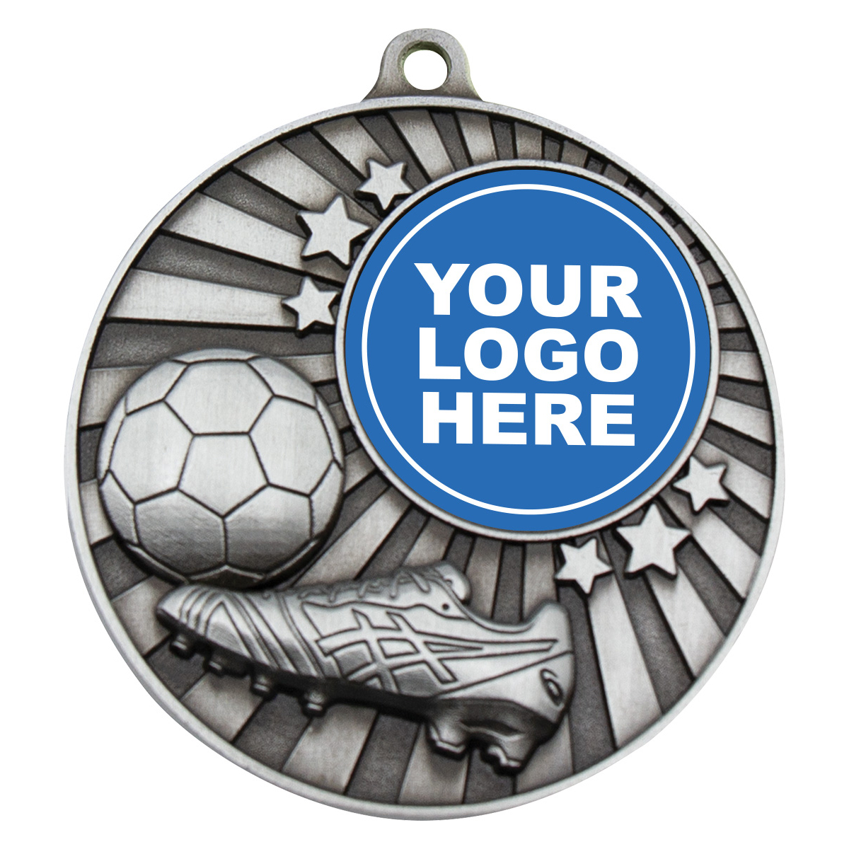 Brilliant Soccer medal features iconic elements of boot and ball while retaining central space for your custom logo to celebrate your club.