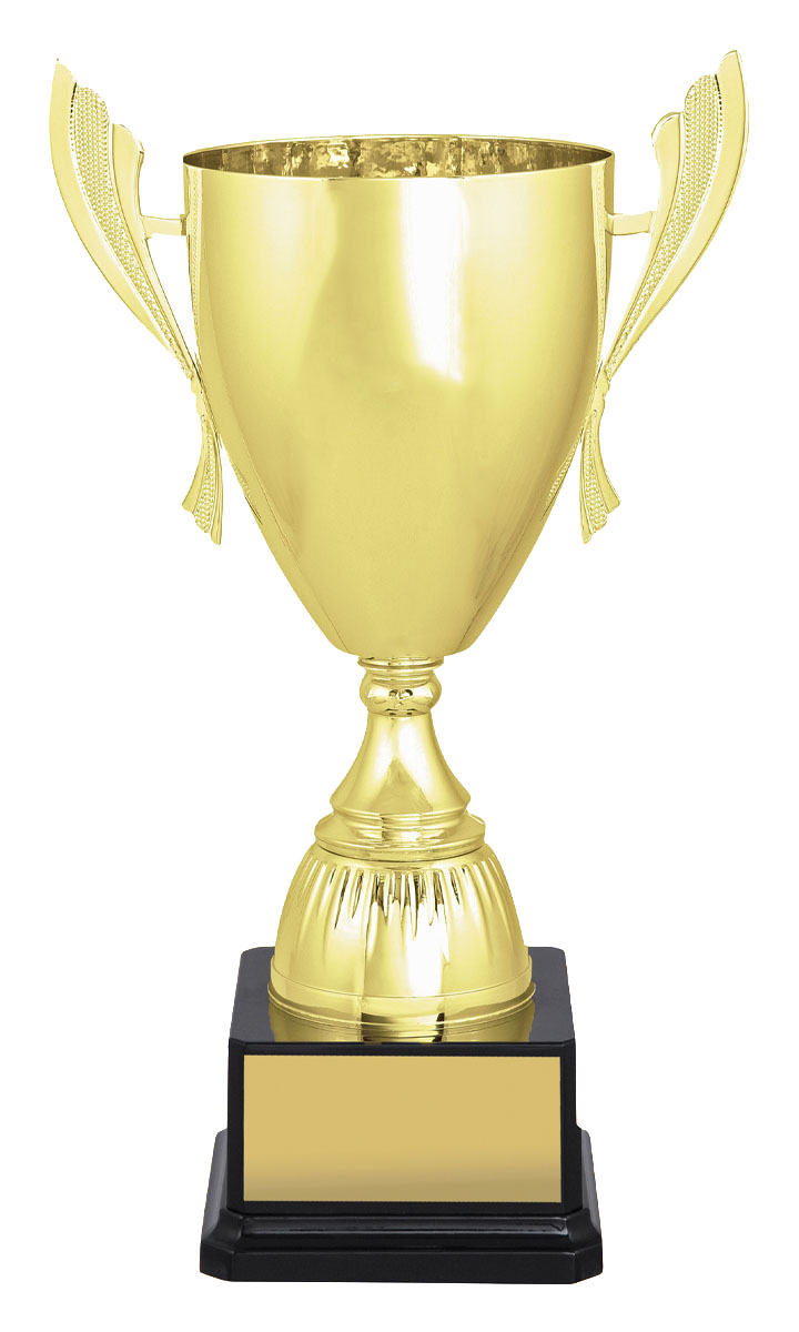 Impressive range of bright gold cups offer variety of sizes to suit your particular award requirements. The elegant and bold design of the cups makes this series well suited to many different sports and activities. Excellent value over 6 different sizes - metal bowl with plastic stem and base.