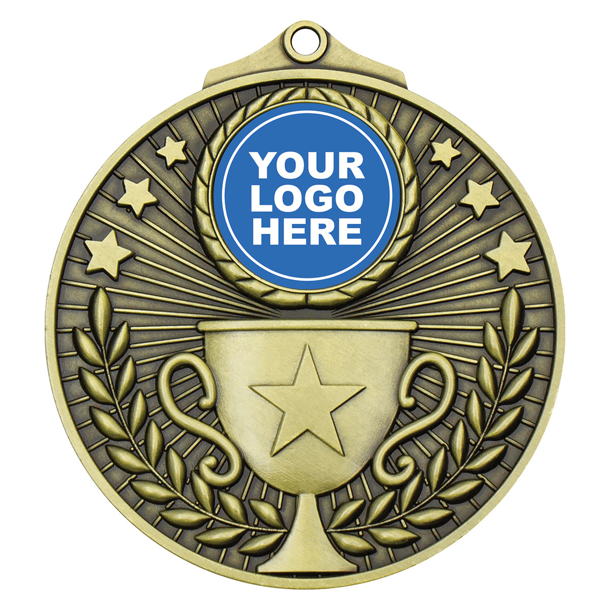 Outstanding cup inspired medal presents larger than standard size with space for your custom logo.