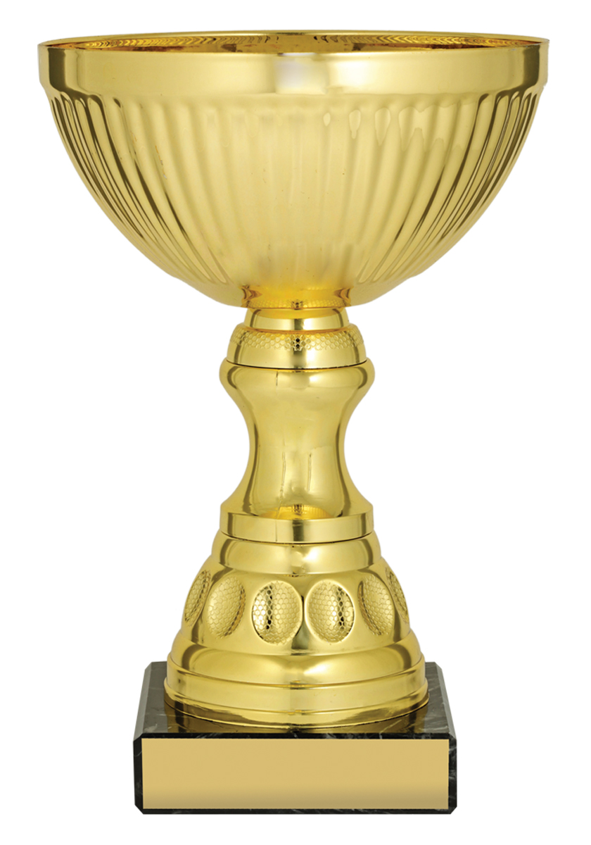 Range of affordable mini gold cups present stylish awards with metal bowl and marble base features. Trophy cups offer clean lines and modern design to suit range of events. Plastic stem.