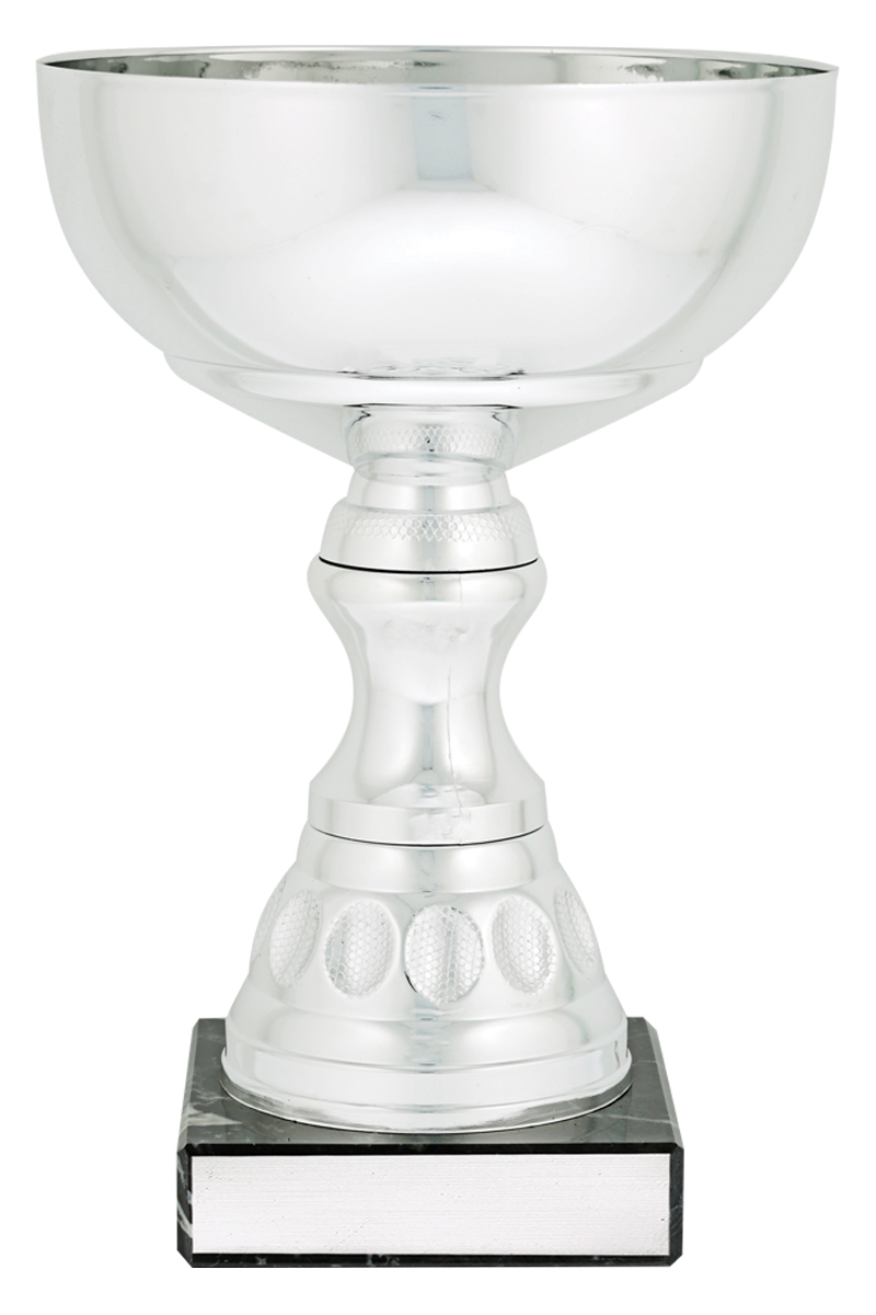 Range of affordable mini silver cups present stylish awards with metal bowl and marble base features. Trophy cups offer clean lines and modern design to suit range of events. Plastic stem.