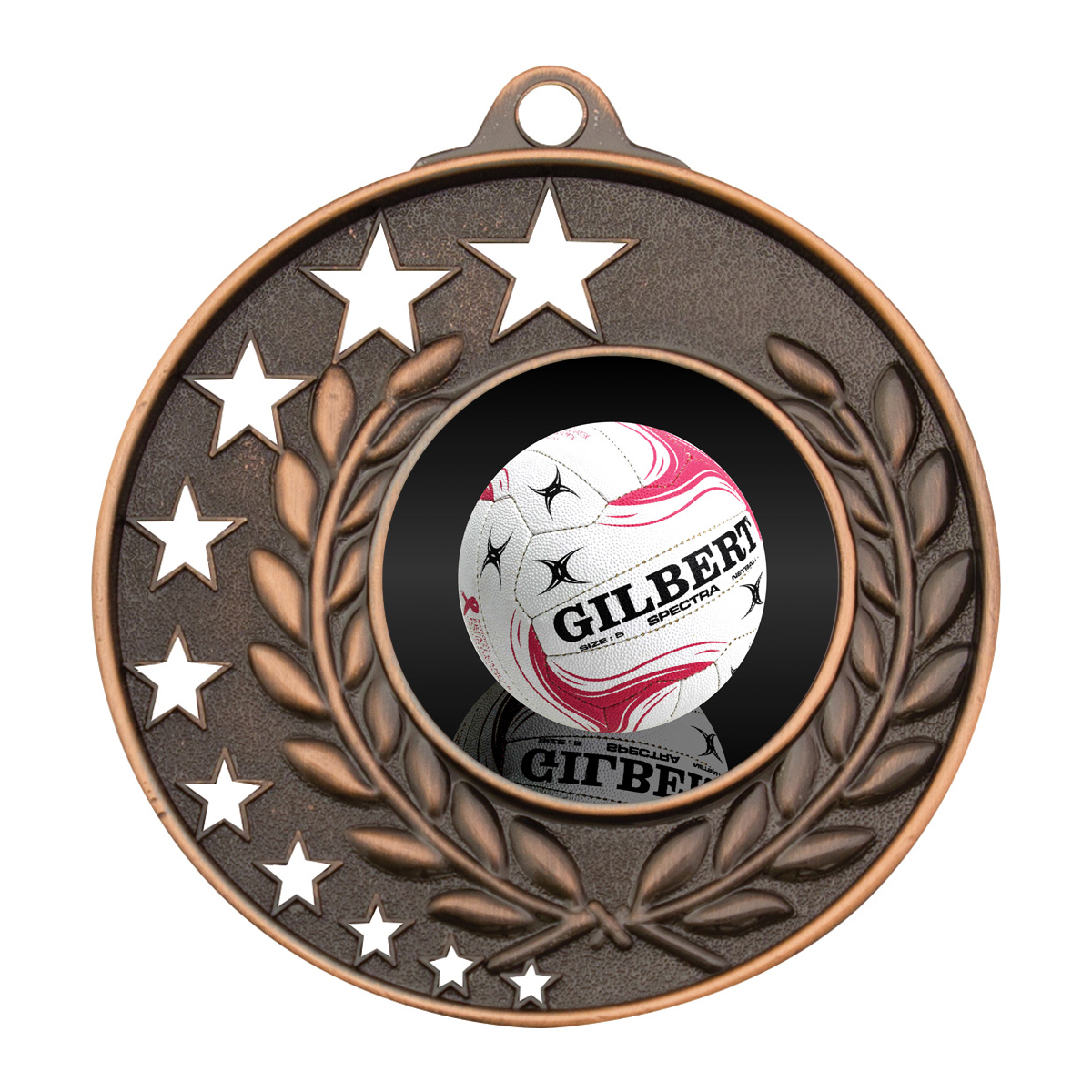 Special design features stars and commemorative wreath with netball insert.