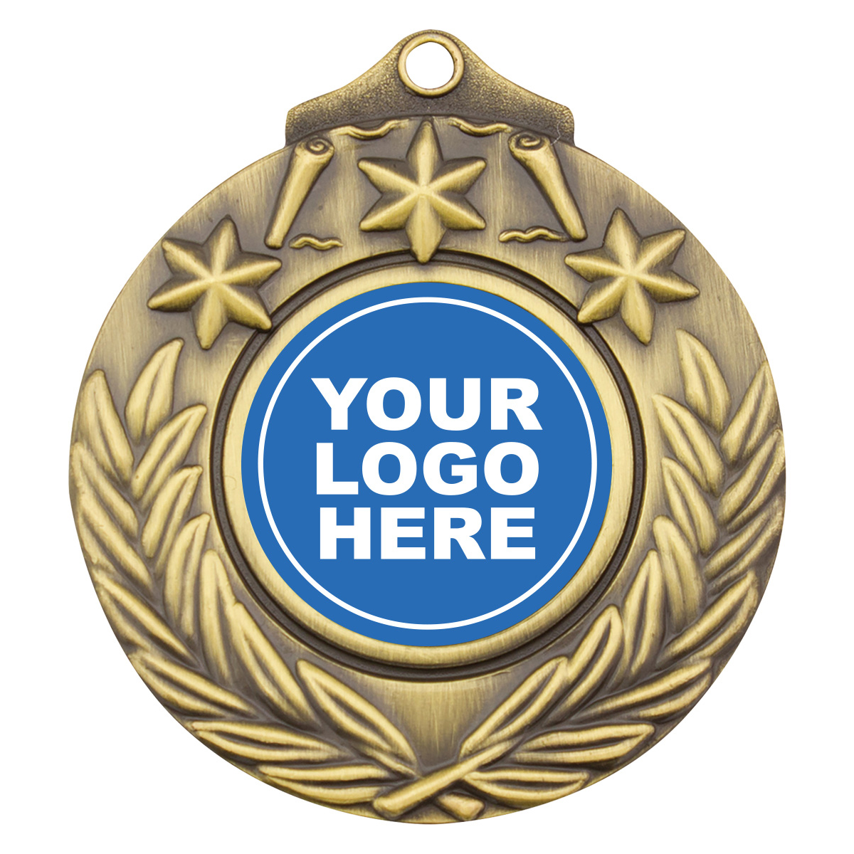 Victory style medal in gold, silver and bronze. Design features both stars and a crossed wreath to commemorate your event or presentation.