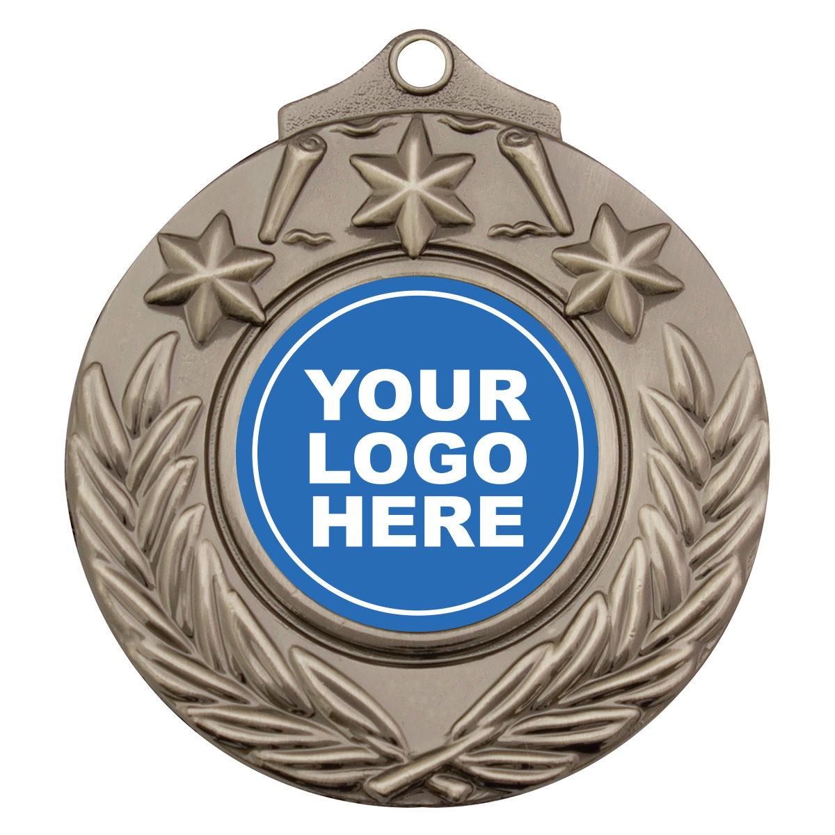 Victory style medal in gold, silver and bronze. Design features both stars and a crossed wreath to commemorate your event or presentation.