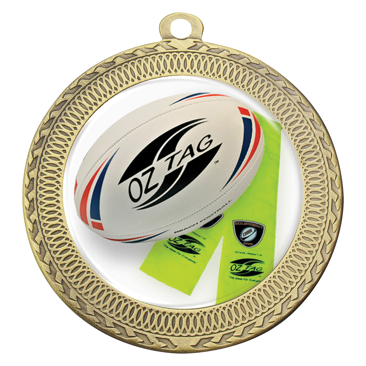 Engraving / Printing Laser engraved black text on 2ply label matched to medal colour.