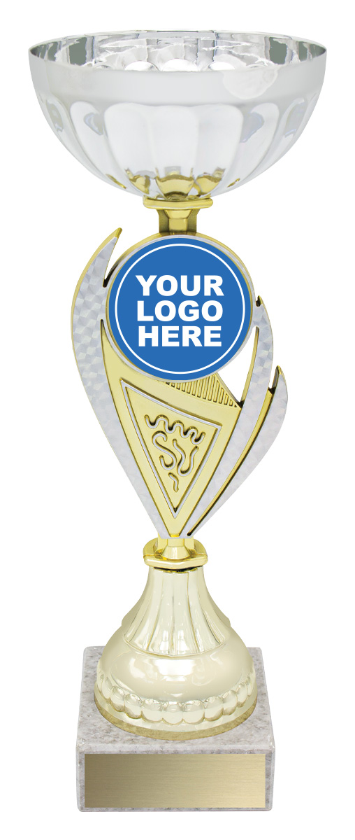 The Trinity Cup offers a dazzling design with space for your custom logo. Metal bowl with plastic stem and marble base.